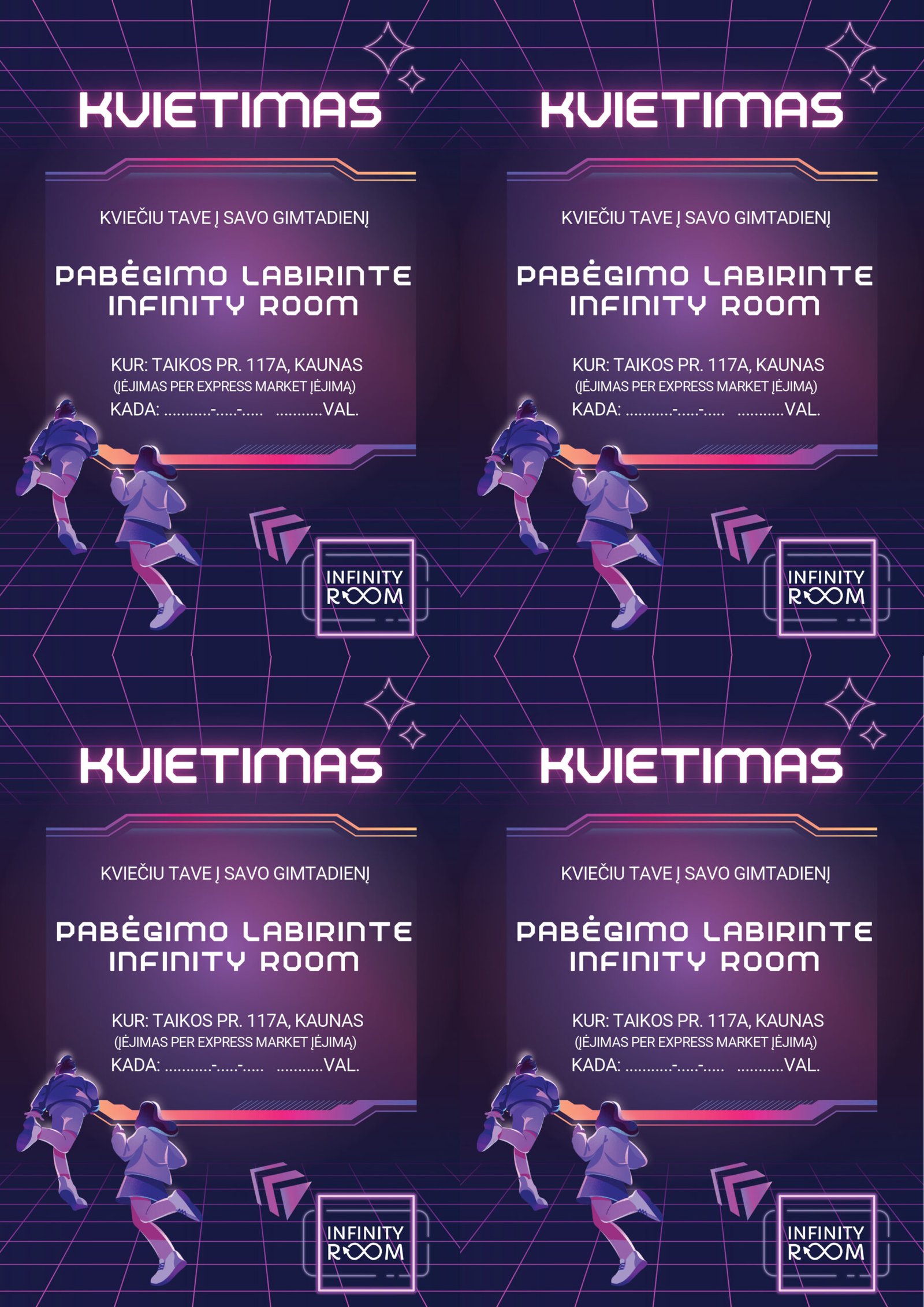 Čia rasite paruoštus pabėgimo kambario „Infinity Room“ kvietimus gimtadieniui.